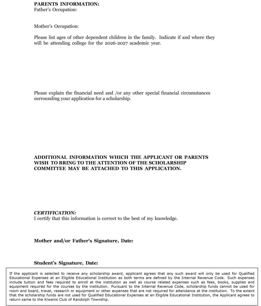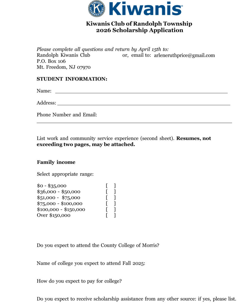 The Randolph Township Kiwanis Club is offering “SCHOLARSHIPS FOR SERVICE” to graduating seniors. Multiple scholarships are available and will be awarded as a one-time distribution of funds. These scholarships are for an accredited college, secondary institution, or technical school. All Randolph residents who are currently enrolled as high school seniors are eligible to apply.